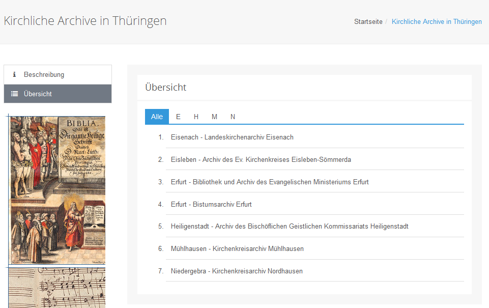 In der linken Hälfte ist zu vielen Archiven eine Fotografie, meist mit einer Ansicht des Archivs oder einer der Archivalien, angezeigt.