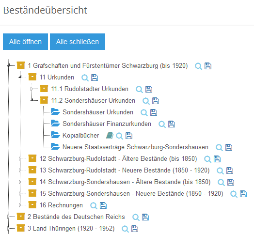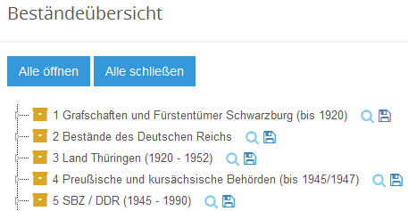 Hier wird in einer hierarchischen Liste eine Übersicht aller zum Archiv gespeicherten Bestände einschließlich ihrer Position in der Archivtektonik abgebildet.