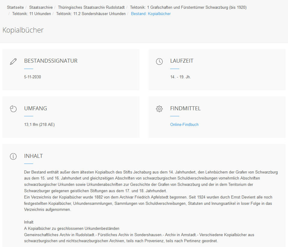 Hier werden folgende Informationen angezeigt: Laufzeit, Umfang, Findmittel, Inhalt. Ist bereits ein Online-Findbuch vorhanden, so kann dieses von hier aus geöffnet werden.