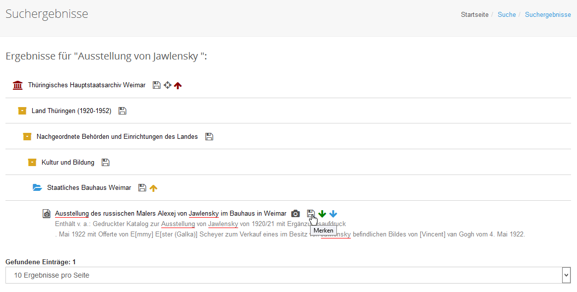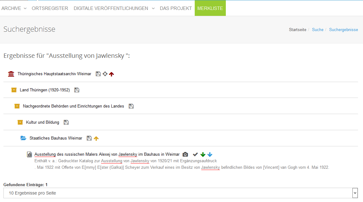 In der Ergebnisliste wird der Name des Treffers sowie ein Auszug des Textes angezeigt. Handelt es sich bei dem Treffer um eine Systematik oder eine Verzeichnungseinheit, so wird durch Klick auf den Text das dazugehörige Online-Findbuch geöffnet. In der Ergebnisliste werden die einzelnen Ebenen bis zum Treffer abgebildet. Suchbegriffe werden farbig markiert.