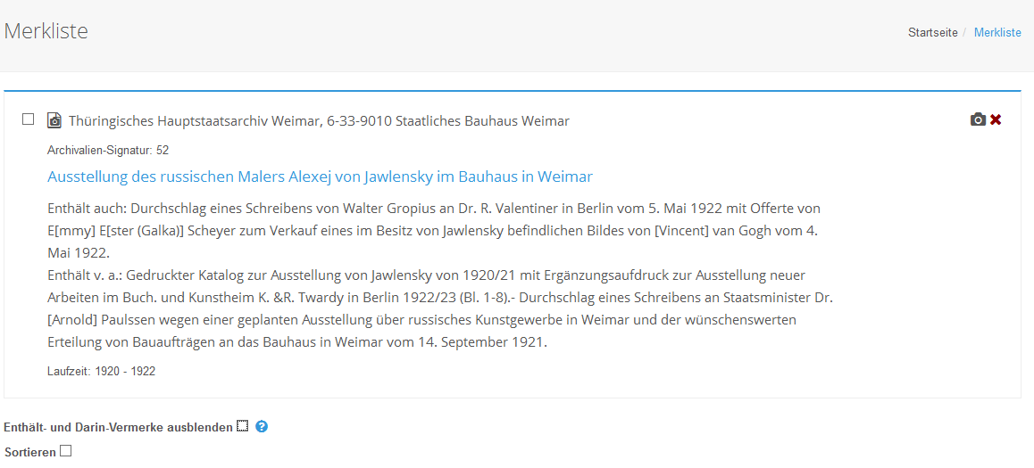 Die Merkliste enthält alle für Aktenbestellungen notwendigen Angaben: Archiv, Name des Bestandes und Archivaliensignatur. Mit diesen Angaben können Sie Archivgut zur Einsicht im Lesesaal des jeweiligen Archivs bestellen.