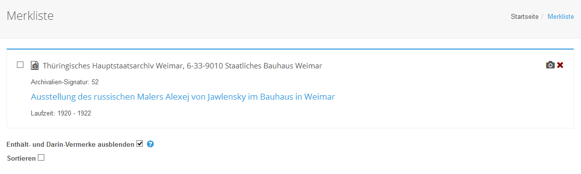 Um eine kompaktere Anzeige zu erhalten, können Sie die "Enthält- und Darin-Vermerke ausblenden"-Option unter den Einträgen der Merkliste auswählen und erhalten folgende Ansicht.