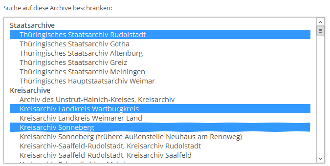 In diesem Feld können Sie Ihre Suche auf ausgewählte Archive beschränken. Wählen Sie ein Archiv durch Anklicken aus. Um mehrere Archive auszuwählen, halten Sie die Taste »Strg« beim Klicken gedrückt. Um ein Archiv wieder abzuwählen, halten Sie ebenfalls diese Taste gedrückt. Die rot geschriebenen Archivarten dienen nur zur optischen Gliederung und werden bei der Suche nicht berücksichtigt.